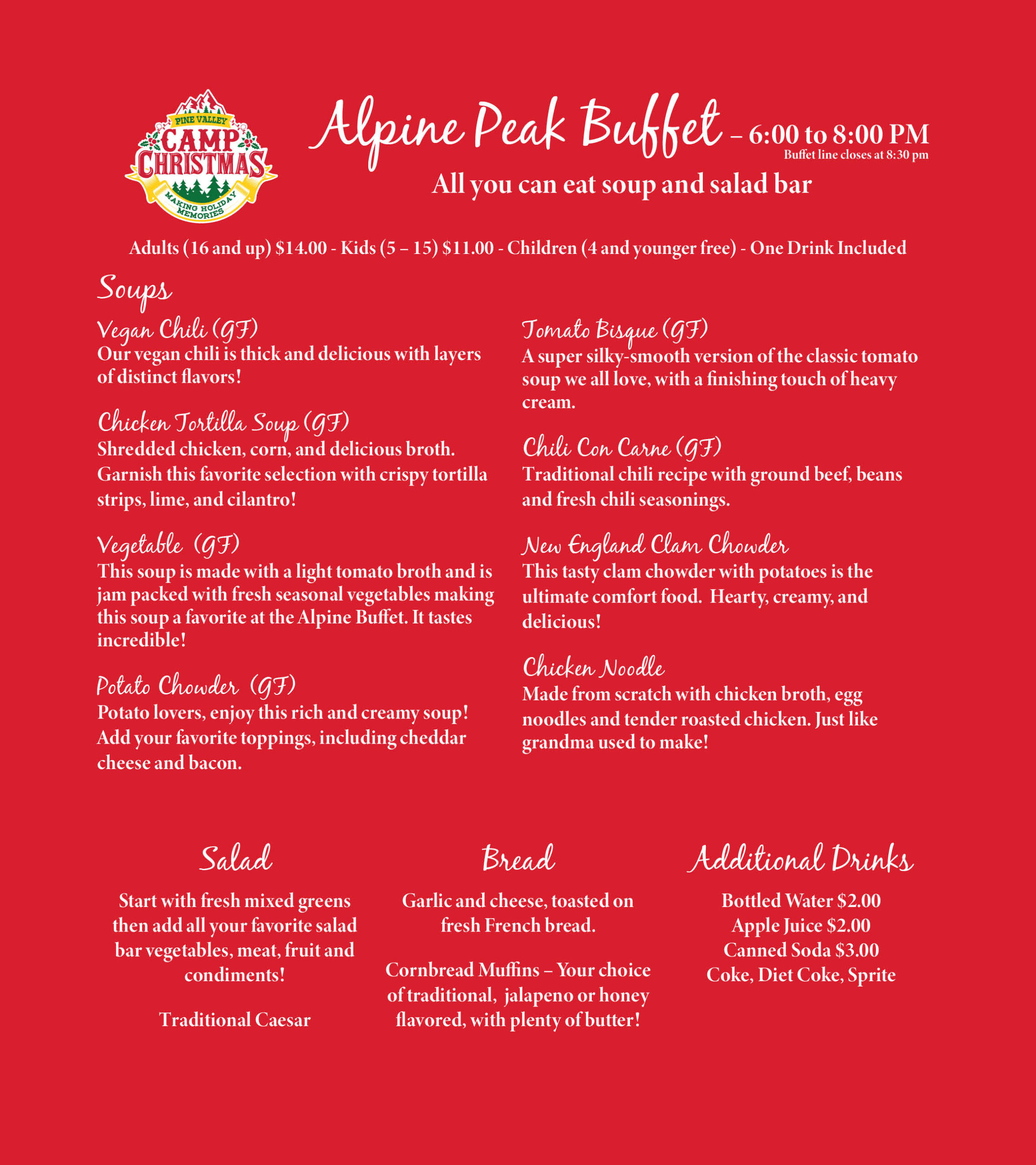 Enjoy your favorite hot soups, chili, and salad bar, along with fresh cornbread and garlic toast at the all-you-can-eat Alpine Peak Buffet Dining Hall. Children 4 and under free, 5 to 15 are $11.00, 16 and older are $14.00, drinks included. Additional drinks are $2-$3.00. Doors are open from 6:00 to 8:00 pm.